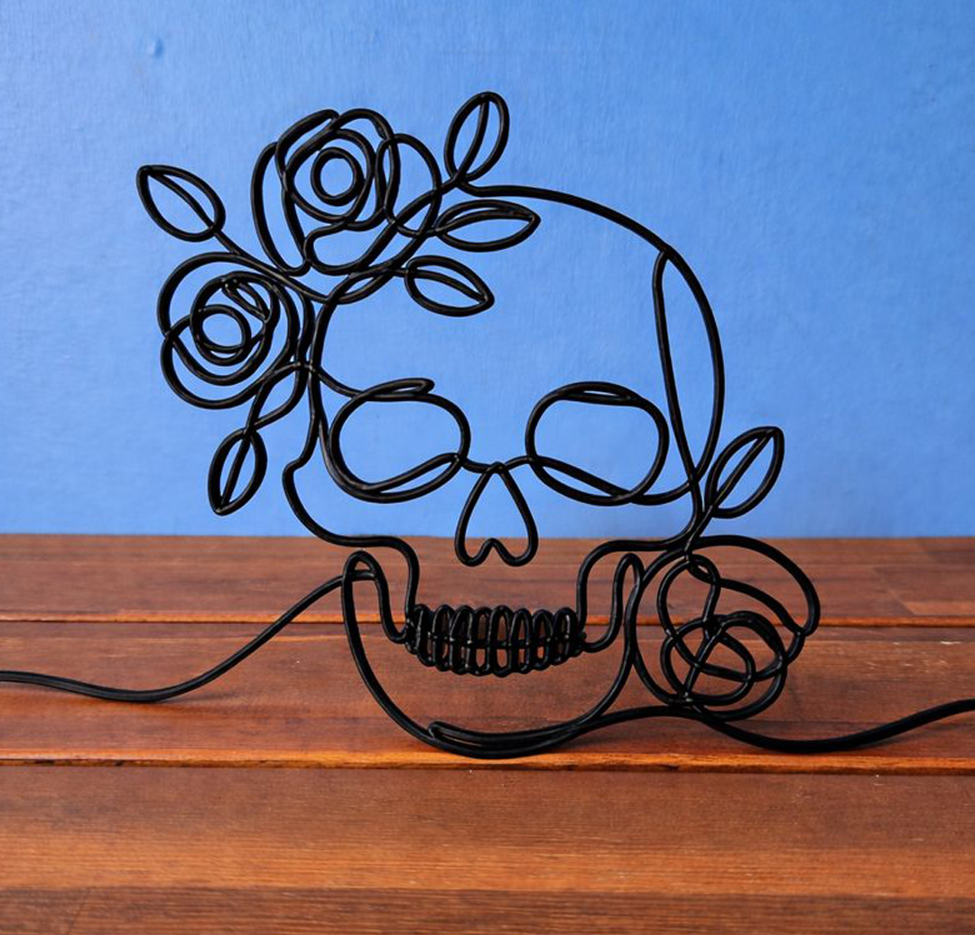 Αυτό το σύρματινο διακοσμητικό κρανίο διαθέτει έναν καθαρό, μινιμαλιστικό σχεδιασμό κρανίου με κομψές ανθικές λεπτομέρειες. Εμπνευσμένο από τη μοντέρνα τέχνη και την αισθητική του Día de los Muertos, το ανοιχτό γραμμικό στυλ δημιουργεί ένα εντυπωσιακό καλλιτεχνικό αντικείμενο που ξεχωρίζει σε γραφεία, ράφια ή τοίχους.
